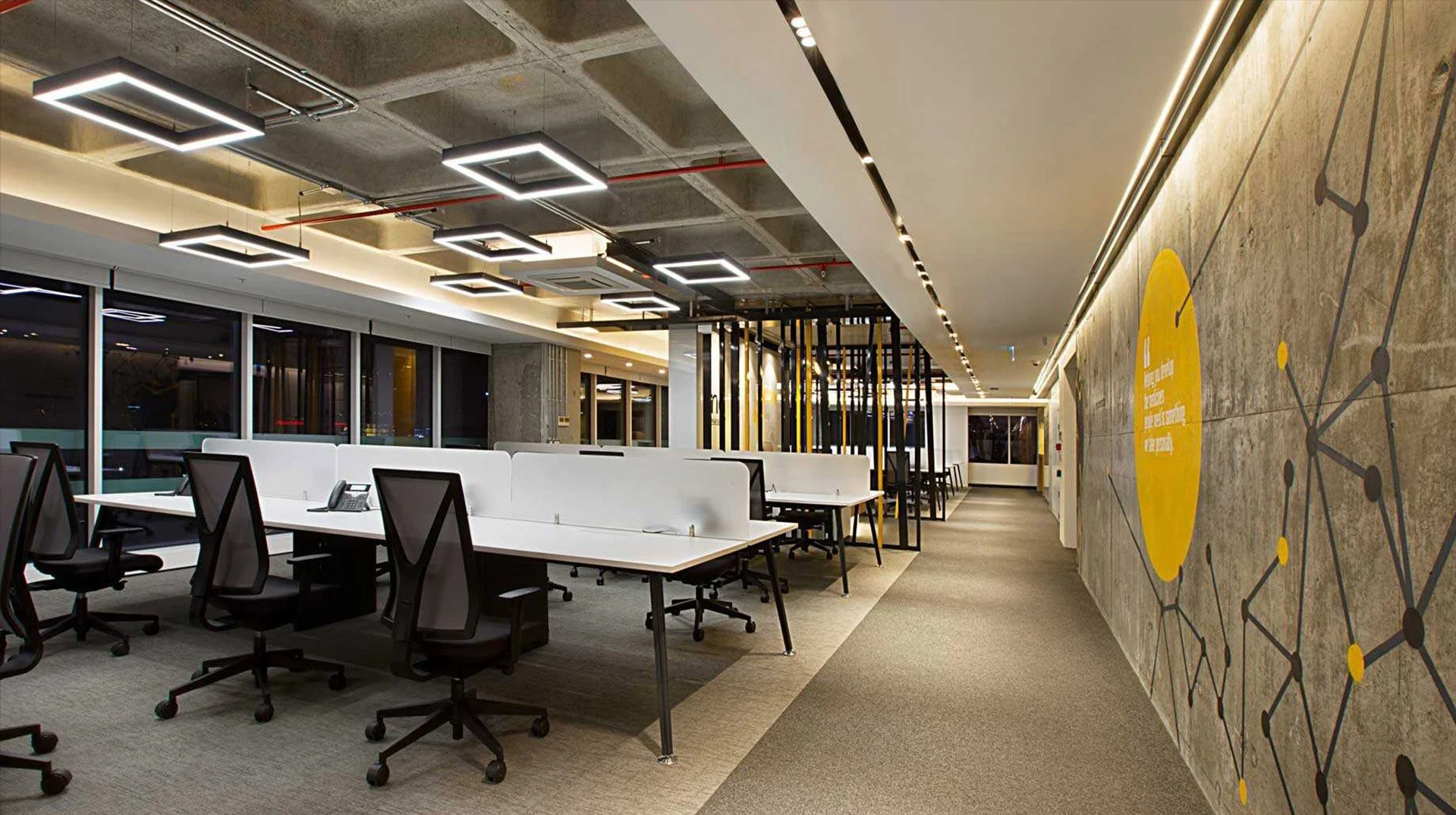The office area is relatively small at 450sqm but grand in its vision. The corporate identity of the company interpreted through graphics designed by our sister company Avcı Architects, gives an extra dimension to the space, which, in its layout, is very simple and minimalist. The relatively low ceiling heights in Nida Kule, finished with concrete coffer slabs, which have been finished surprisingly well, provided a great background to specially designed square strips distributed throughout the space in an abstract pattern. As in all the projects of Avcı Architects of various scales, the use of local natural materials has been the priority.